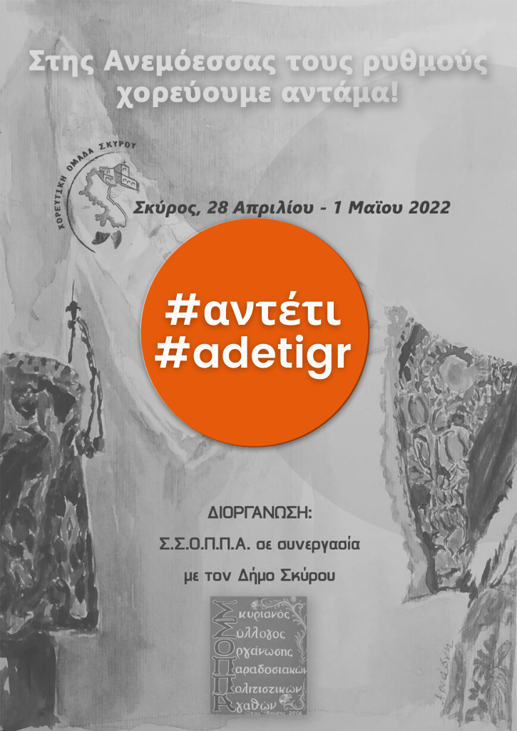 Ο Σκυριανός Σύλλογος Οργάνωσης Παραδοσιακών Πολιτιστικών Αγαθών (Σ.Σ.Ο.Π.Π.Α.) σε συνεργασία με τον Δήμο Σκύρου διοργανώνουν στην Σκύρο το 2ο αντάμωμα χορευτικών συλλόγων από την Πέμπτη 28 Απριλίου έως την Κυριακή 1 Μαΐου 2022, με δυο μουσικοχορευτικές βραδιές στις 29 & 30 Απριλίου στην κεντρική πλατεία της Σκύρου.