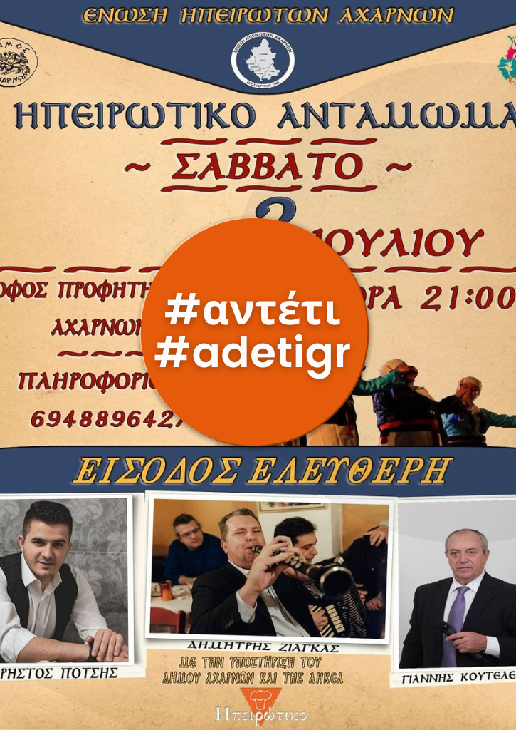 Η 'Ενωση Ηπειρωτών Αχαρνών διοργανώνει Ηπειρώτικο Αντάμωμα, το Σάββατο 2 Ιουλίου 2022 στις 9μ.μ. στο Λόφο Προφήτη Ηλία Αχαρνών.