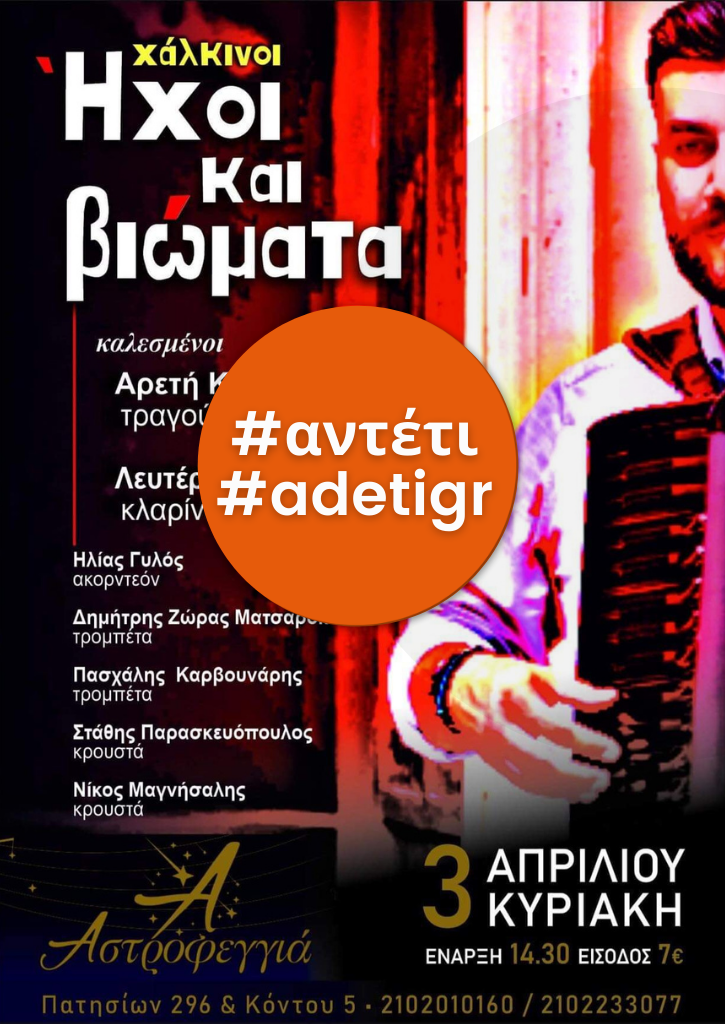 Την Κυριακή 3 Απριλίου διοργανώνεται μουσική βραδιά με θέμα ''Χάλκινοι ήχοι και βιώματα'' στο κέντρο Αστροφεγγιά, με καλεσμένους την Αρετή Κετιμέ στο τραγούδι  και τον Λευτέρη Δίγκα στο κλαρίνο.