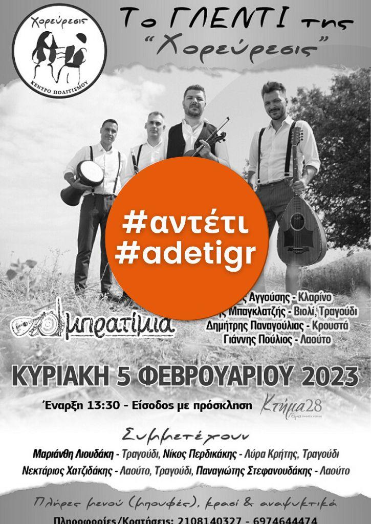 Σας προσκαλούμε στον Ετήσιο Χορό - Κοπή Πίτας που διοργανώνει το Κέντρο Πολιτισμού "Χορεύρεσις", Κυριακή 5 Φεβρουαρίου 2023 και ώρα 13.00, στο Κτήμα 28 (Πολυχώρος Νικολέλη / Παράδρομος Ε.Ο. Αφίδνες).