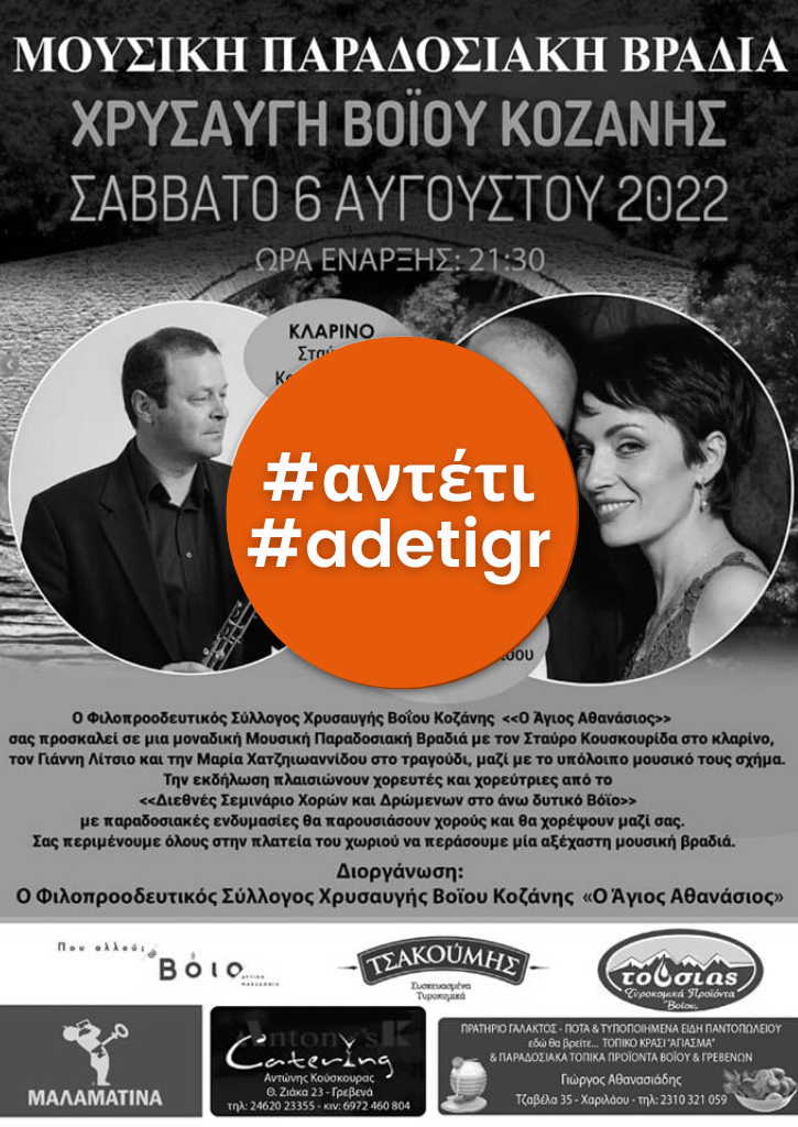 Ο Φιλοπροοδευτικός Σύλλογος Χρυσαυγής Βοϊου Κοζάνης ''Ο Αγιος Αθανάσιος'' σας προσκαλεί σε μια μοναδική Μουσική Παραδοσιακή Βραδιά με τον Σταύρο Κουκουρίδα στο κλαρίνο, τον Γιάννη Λίτσιο και την Μαρία Χατζηιωανίδου στο τραγούδι, μαζί με το υπόλοιπο μουσικό τους σχήμα. Την εκδήλωση πλαισιώνουν χορευτές και χορεύτριες από το ''Διεθνές Σεμινάριο Χορών και Δρώμενων στο άνω δυτικό Βοϊο'' με παραδοσιακές ενδυμασίες θα παρουσιάσουν χορούς και θα χορέψουν μαζί σας.