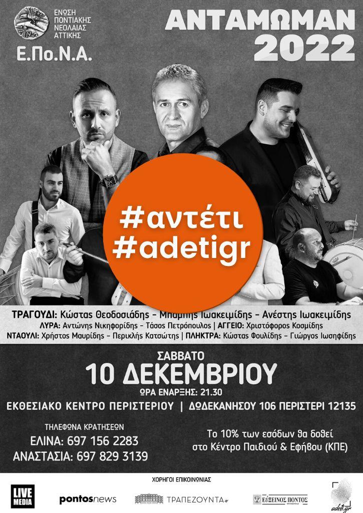 Σας ενημερώνουμε ότι ο ετήσιος χορός της Ένωσης, «Αντάμωμαν 2022», θα πραγματοποιηθεί το Σάββατο 10 Δεκεμβρίου 2022, με ώρα έναρξης μουσικού προγράμματος τις 21:30, στο «Εκθεσιακό Κέντρο Περιστερίου» (Δωδεκανήσου 106, Περιστέρι, Τ.Κ. 12135).