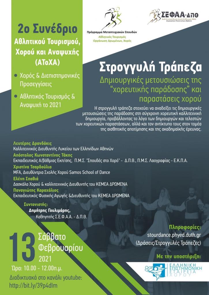 Το Μεταπτυχιακό Πρόγραμμα Σπουδών «Αθλητικός Τουρισμός, Οργάνωση Δρωμένων, Χορός» της Σ.Ε.Φ.Α.Α. του Δ.Π.Θ. διοργανώνει το 2ο Συνέδριο Αθλητικού Τουρισμού, Χορού και Αναψυχής (ΑΤοΧΑ).