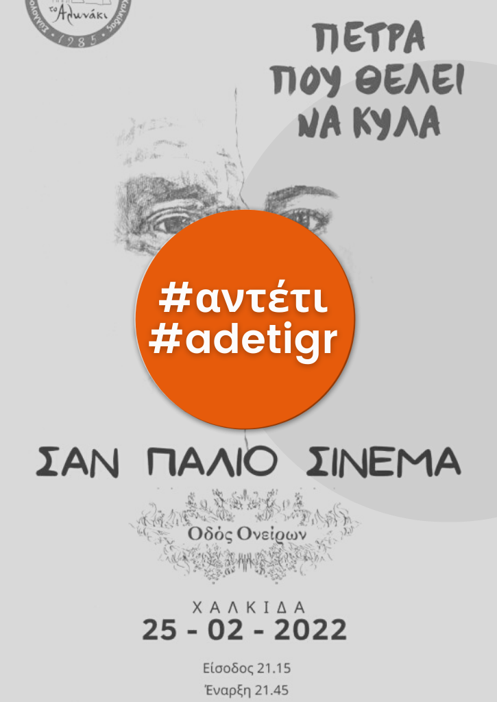 Η δεύτερη - από τις τρεις - θεματική εκδήλωση «Πέτρα που θέλει κυλά» του Συλλόγου το Αλωνάκι, θα πραγματοποιηθεί την Παρασκευή 25 Φεβρουαρίου 2022 στην Οδό Ονείρων στη Χαλκίδα, Τσιριγώτη 4. Θεματολογία της, η μουσική και ο λόγος επενδυμένες από τον ελληνικό χορό στον ελληνικό κινηματογράφο. Εμπνευσμένα και αναδημιουργημένα πολιτισμικά στοιχεία  από τη δημοτική και τη λόγια μουσική σε μια εξελικτική πορεία, φτάνοντας βέβαια ως τη σύγχρονη μουσική δημιουργία. Η συνέργεια των ελληνικών ρυθμών, της ελληνικής μουσικής και του ελληνικού τραγουδιού στην έβδομη τέχνη, θα μπει στο μεγεθυντικό μας φακό.