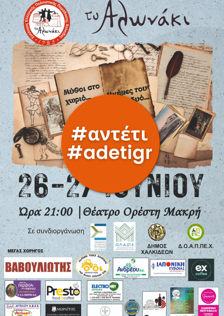 Ο Σύλλογος Ελληνικής Πολιτιστικής Παράδοσης Χαλκίδας «Το Αλωνάκι» θα πραγματοποιήσει διήμερη εκδήλωση με θέμα: Μύθοι στο Χωριό… μνήμες του εικοσιδυό» το διήμερο 26-27 Ιουνίου 2022 και ώρα 9:00 μ.μ στο Θέατρο “Ορέστης Μακρής” στη Χαλκίδα.