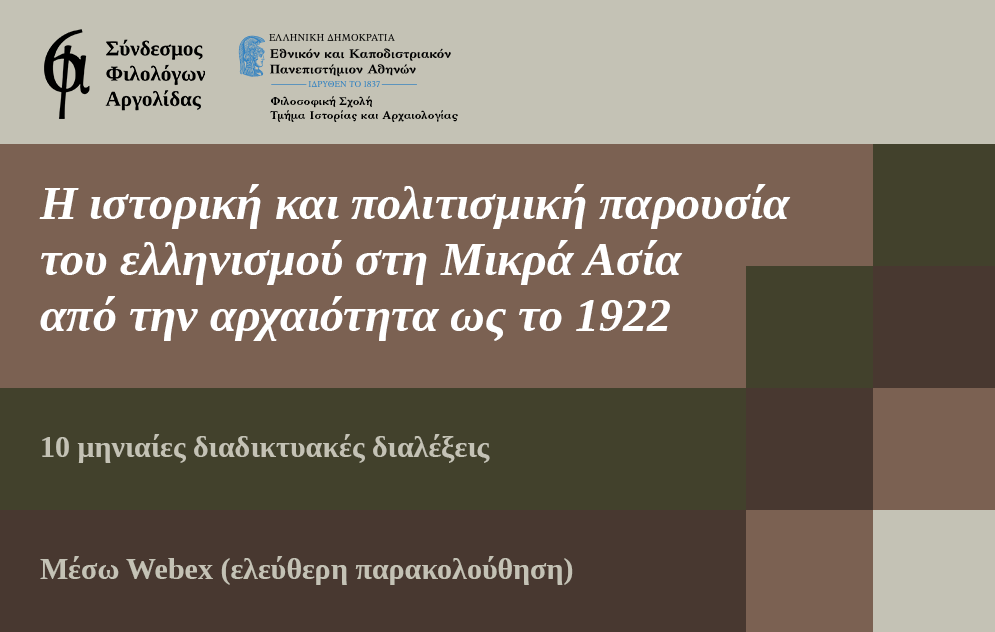 Καθώς το 2022 είναι έτος μνήμης για τον Μικρασιατικό Ελληνισμό, το τμήμα Ιστορίας και Αρχαιολογίας της Φιλοσοφικής Σχολής του Εθνικού και Καποδιστριακού Πανεπιστημίου Αθηνών και ο Σύνδεσμος Φιλολόγων Αργολίδας θα προσφέρουν διαδικτυακά σειρά 10 διαλέξεων για την ιστορική και πολιτισμική παρουσία του ελληνισμού στην περιοχή, από την αρχαιότητα ως το 1922.