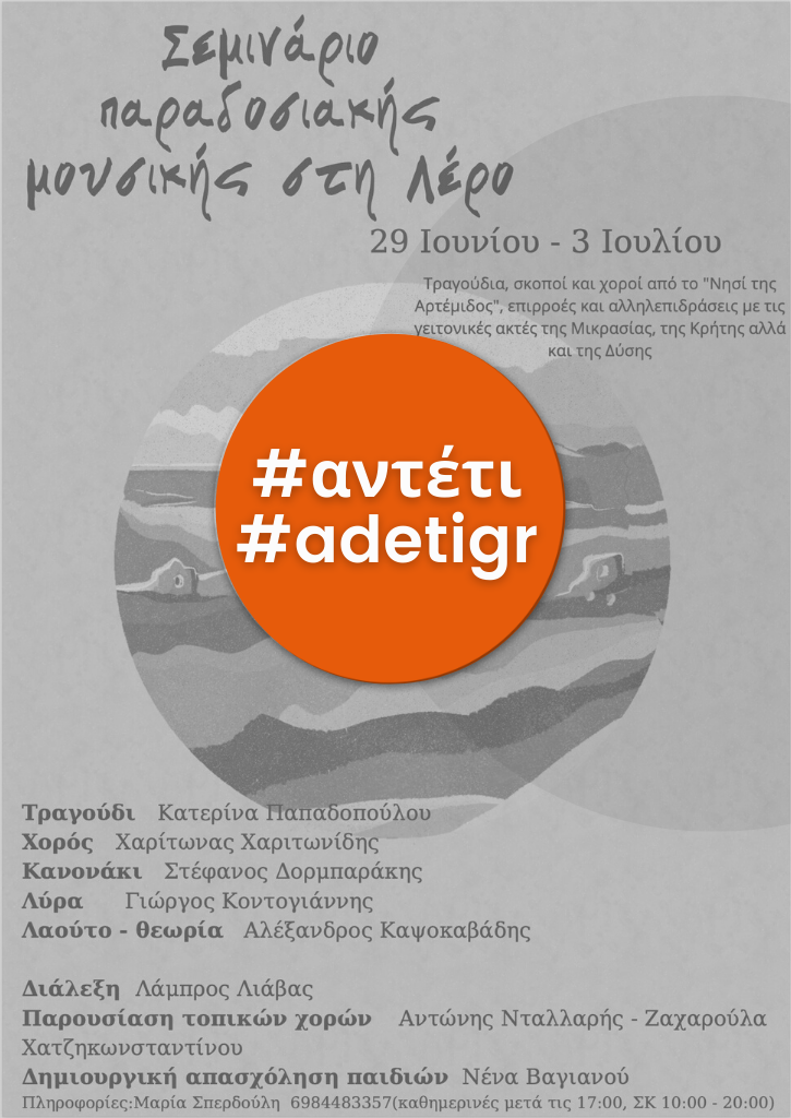 Σεμινάριο παραδοσιακής μουσικής στη Λέρο 29 Ιουνίου - 3 Ιουλίου. Γνωριμία με τη μουσική παράδοση της Λέρου, γνωριμία με τον τόπο, τα τραγούδια, τις μυρωδιές, τις γεύσεις.