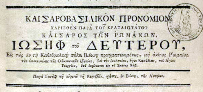 Στα 1690 ο αυτοκράτορας Λεοπόλδος Α' παραχώρησε στους ορθόδοξους Σέρβους που έρχονταν να εγκατασταθούν στη Βιέννη προνόμιο, το οποίο αναγνώριζε την άσκηση της θρησκείας τους και τη λειτουργία της εκκλησίας τους. Έτσι, οι Σέρβοι υπήρξαν οι πρώτοι ορθόδοξοι της αψβουργικής μοναρχίας στους οποίους δόθηκαν προνόμια, από τα οποία προσπάθησαν να επωφεληθούν και οι Έλληνες. Λίγο αργότερα, στα 1717, ο αυτοκράτορας Κάρολος ΣΤ' εξέδωσε πατέντα, δηλαδή "διάταξιν περί του καμπίου εις όφελος των πραγματευομένων", η οποία απευθυνόταν στους ορθόδοξους οθωμανούς υπηκόους που εμπορεύονταν στη Βιέννη και κατοχύρωνε νομοθετικά την ανάπτυξη του εμπορίου καθορίζοντας τους όρους διεξαγωγής του. Το διάταγμα αυτό ανανέωσε η Μαρία-Θηρεσία στα 1763 ιδρύοντας παράλληλα και καμπιαλοκριτήριο, δηλαδή δικαστήριο που εκδίκαζε τις εμπορικές και χρηματικές υποθέσεις των ορθόδοξων εμπόρων. Το προνόμιο της Μαρίας-Θηρεσίας αναγνωρίστηκε και επικυρώθηκε από τους διαδόχους της Ιωσήφ Β' (1783), Λεοπόλδο Β' (1791) και Φραγκίσκο Β' (1794).