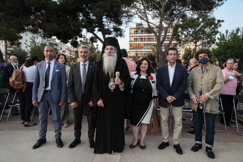 Την εκδήλωση χαιρέτισαν ο κ. Δημήτριος Καρύδης – Αντιδήμαρχος Προγραμματισμού και Ανάπτυξης εκ μέρους του Δημάρχου Πειραιά κ. Ιωάννη Μώραλη, ο κ. Χρίστος Δημόπουλος – Πρόεδρος του Συνδέσμου Ποντιακών Σωματείων Ν. Ελλάδος & Νήσων της Παμποντιακής Ομοσπονδίας Ελλάδος και η κα. Φωτεινή Υψηλάντη εκ μέρους του δωρητή του μνημείου κ. Ευάγγελου Μαρινάκη.